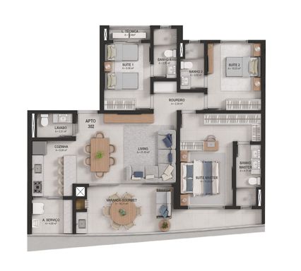 São 3 suítes bem distribuídas, com suíte master equipada com cuba dupla, lavabo, cozinha em conceito aberto integrada à área social e uma varanda gourmet com churrasqueira a carvão que se estende, conectando os ambientes e valorizando a iluminação natural. O resultado é um espaço fluido, sofisticado e acolhedor.