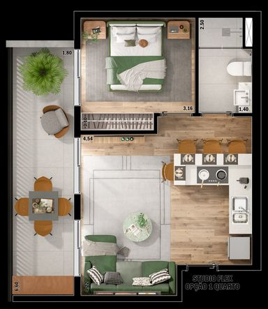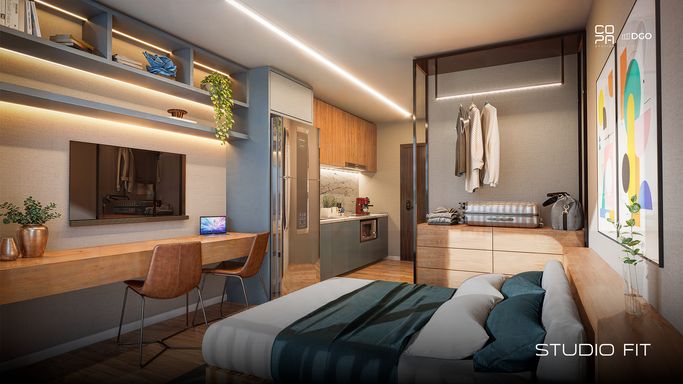 • Studio Fit (24m² a 26m²): Foco total em praticidade e alta rotatividade.