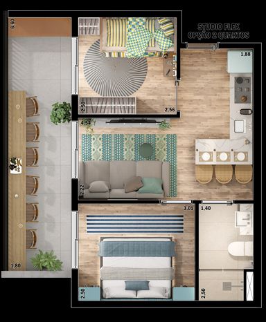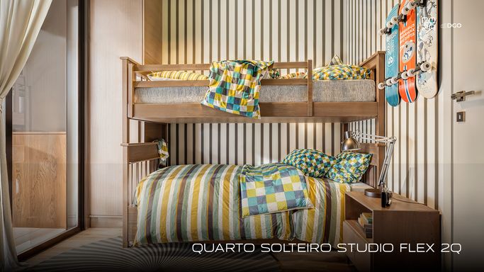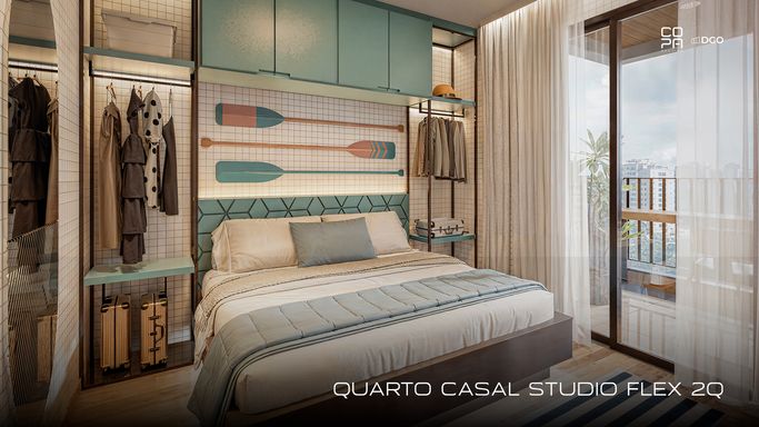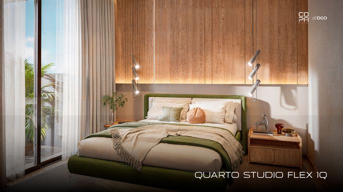• Studio Flex (47m²): Versatilidade máxima com opções de 1 ou 2 dormitórios, acomodando até 6 pessoas.